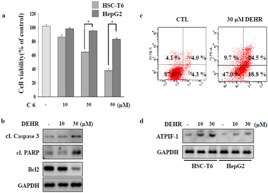 3,5-diethoxy-3′-hydroxyresveratrol (DEHR) inhibits the proliferation of activated hepatic stellate cells (HSCs). (a) HSC-T6 and HepG2 cells were treated with DEHR, and the MTT assay was performed to assess cell viability. (b) The expression levels of cleaved poly (ADP-ribose) polymerase (PARP), cleaved caspase-3, and Bcl2 were analyzed by Western blotting. Glyceraldehyde-3-phosphate dehydrogenase (GAPDH) served as a loading control. (c) Cells were incubated with 30 μM of DEHR for 24 h and subsequently stained with Annexin-V/PI. (d) The expression of ATPIF-1 was evaluated by Western blotting using GAPDH as a loading control. Data are representative of three independent experiments and expressed as mean ± SD (n = 3), * p < 0.05.