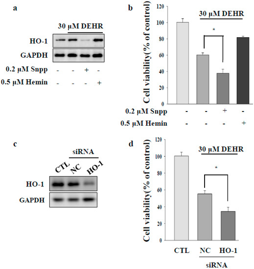 Inhibition of the cytoprotective protein HO-1 contributes to apoptotic cell death by DEHR. (a) Expression of HO-1 was analyzed by Western blotting. (b) To elucidate the HO-1 signaling pathway involved in DEHR-induced apoptosis of HSCs, a specific inhibitor of SnPP (tin protoporphyrin) and an inducer of hemin were used. HSCs were treated with DEHR, and the MTT assay was performed to assess cell viability. To confirm these findings, cells were transfected with siHO-1 and treated with DEHR. (c) Expression of HO-1 was analyzed by Western blotting. (d) The MTT assay was performed to assess cell viability. Data are representative of three independent experiments and expressed as mean ± SD (n = 3), * p < 0.05.