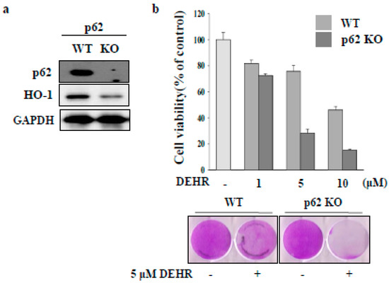 Inhibition of the cytoprotective protein p62 contributes to apoptotic cell death by DEHR. (a) HO-1 expression was detected in p62 wild-type cells. (b) The MTT assay was performed to assess cell viability in cells treated with DEHR. Data are representative of three independent experiments and expressed as mean ± SD, * p < 0.05.