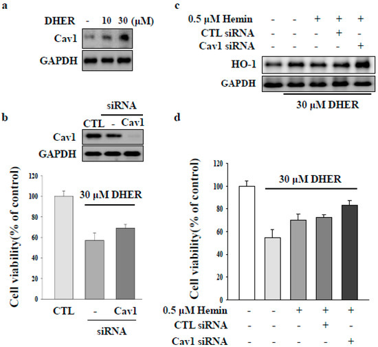 Caveolin-1 (CAV1) contributes to apoptotic cell death by DEHR. (a) The expression of CAV1 after treatment of cells with DEHR was analyzed by Western blotting. (b) Cells transfected with siCAV1 and treated with DEHR. (c) DEHR-induced apoptosis of HSCs decreased following treatment with the specific HO-1 inducer, hemin. The expression of HO-1 was analyzed by Western blotting. (d) MTT assay was performed to assess cell viability. Data are representative of three independent experiments and expressed as mean ± SD.
