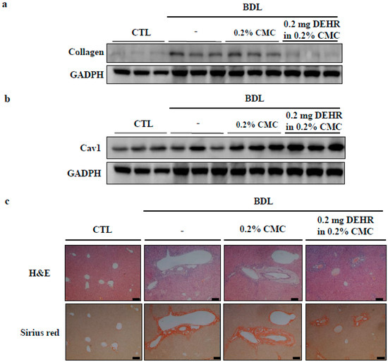 To determine whether DEHR reduces the severity of hepatic fibrosis in an animal model, hepatic fibrosis was induced in a mouse BDL model of hepatic fibrosis for a period of four weeks. The content of hepatic collagen, a marker of fibrosis, is shown in Figure 5. At week four, the collagen concentration in BDL mice abruptly increased [27]. This finding was consistent with the enlarged spleen and bile in the gall bladder (Figure S2), suggesting the success of the surgery in establishing hepatic fibrosis. The increased collagen concentration in BDL mice was significantly decreased following treatment with DEHR at a dose of 0.2 mg/kg body weight (Figure 5A). Furthermore, the decrease in the expression of CAV1 in BDL mice was restored by DEHR treatment for four weeks (Figure 5B). Hematoxylin and eosin staining was performed to investigate the presence of fibrous hyperplasia (Figure 5C). DEHR treatment significantly reduced fibrous hyperplasia around the central veins. These results indicate that DEHR ameliorates liver fibrosis in vitro and in vivo by decreasing collagen concentration and activating CAV1 expression.
