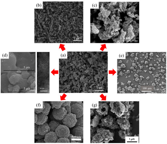 SEM morphologies of polypyrrole (PPy) and its composites: (a) granular PPy and (b) PPy nanofibers, reprinted with permission from [39]. Copyright Elsevier, 2011; (c) PPy-HNT particles, reprinted with permission from [41]. Copyright Springer Nature, 2014; (d) PPy/MCM-41 particles, reprinted with permission from [43]. Copyright Elsevier, 2010; (e) PPy-polycaprolactone (PPy-PCL) composites, reprinted with permission from [44]. Copyright Springer Nature, 2007; and, core-shell structures of (f) PPy-silica, reprinted with permission from [48]. Copyright RSC Publishing, 2016 and (g) PPy-TiO2, reprinted with permission from [49]. Copyright Springer Nature, 2011.