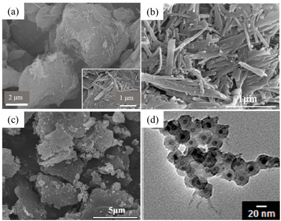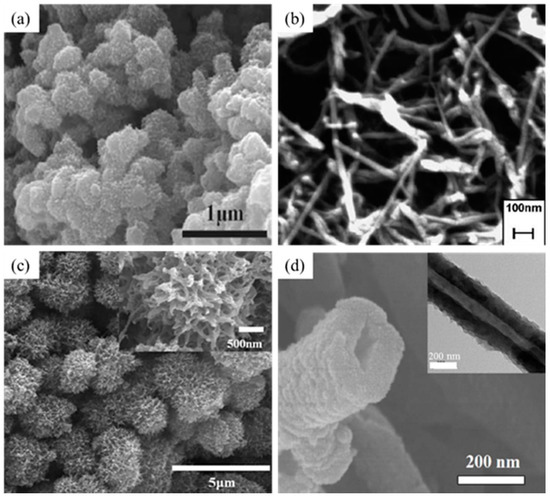 SEM images of synthesized polyaniline (PANI): (a) spheres, reprinted with permission from [55]; Copyright Spring Nature, 2013; (b) fibers, reprinted with permission from [52]. Copyright American Chemical Society, 2009; (c) urchin-like, reprinted with permission from [56]. Copyright John Wiley and Sons, 2009; and (d) nanotubes, reprinted with permission from [57]. Copyright American Chemical Society, 2006.