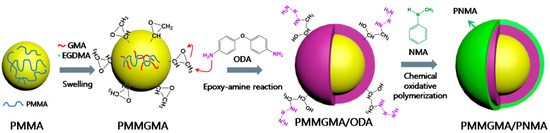 Schematic diagram of fabrication of poly(methyl methacrylate)/poly(N-methylaniline) (PMMA–PNMA) core-shell particles, reprinted with permission from [77]. Copyright Elsevier, 2015.