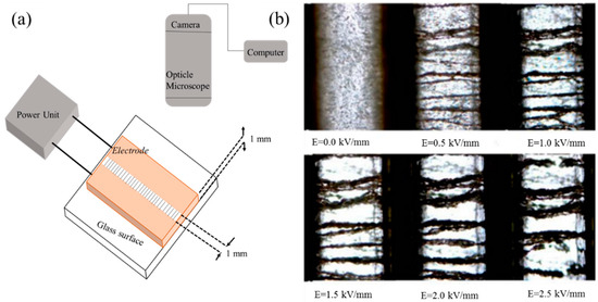 (a) Schematic illustration of polarizability measuring device; (b) optical microscope (OM) images showing the polarization of nanocube-TiO2/poly(3-octhlthiophene)-based ER fluid, reprinted with permission from [104]. Copyright John Wiley and Sons, 2016.
