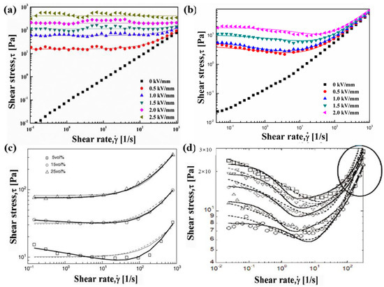 Shear stress vs. shear rate for: (a) PS/PANI-based ER suspension (solid lines for Bingham equation), reprinted with permission from [112]. Copyright Elsevier, 2017; (b) PANI@ATP-based ER suspension (solid lines for CCJ equation), reprinted with permission from [59]. Copyright Elsevier, 2017; (c) poly(naphthalene quinone)-based ER fluid (dashed lines for Bingham equation, solid lines for De Kee-Turcotte equation, and bold solid lines for CCJ equation), reprinted with permission from [84]. Copyright American Chemical Society, 2012; and (d) PMMA/PANI-based ER fluid (dotted and solid lines for CCJ equation and four-parameter equation), reprinted with permission from [117]. Copyright Elsevier, 2005.