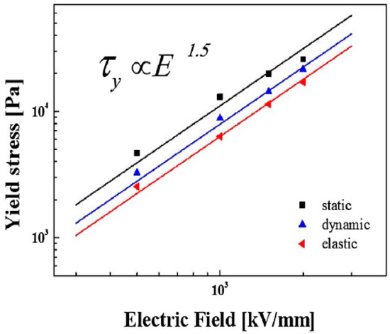 where represents a volume fraction and L represents the electrode separation. and are the maximum dimensionless restoring force and angle, respectively. This expression means that the dynamic yield stress is essentially proportional to the squared electrical field strength. However, although some experiments confirmed this result [120,121], the effects of the particular material, concentration, shape, and electric field strength will cause the index to deviate from 2.0 [122,123]. As shown in Figure 13, Sung et al. [124] observed that the yield stress of a highly substituted potato starch phosphate (HPSP)-based ER fluid was not proportional to E2, which deviated from the polarization model because of the non-spherical shape of HPSP.