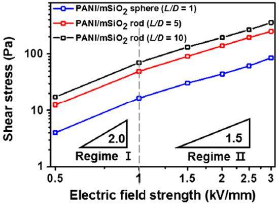Moreover, as shown in Figure 14, the yield stresses of PANI/mSiO2-based ER suspensions can be separated into two different areas in the entire electric field strength ranges [127]. Choi et al. [128] proposed a critical electrical field strength (Ec) and developed the following simplified equation to represent a hybrid yield stress for a wide electrical field strength area:
