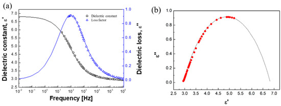 A high dielectric constant shows a useful effect on the ER response because of the more effectively achievable polarizability. In general, the dielectric property is measured by an inductance capacitance resistance (LCR) tester. Figure 15 represents both the dielectric spectrum and the Cole–Cole curve of POA-silica composites [82]. The permittivity is frequency-dependent and can be expressed in its complex form involving permittivity () and the loss factor (): . The polarizability is described as the permittivity difference of and relaxation time (), which are obtained by fitting the dielectric spectra with the Cole–Cole formula.