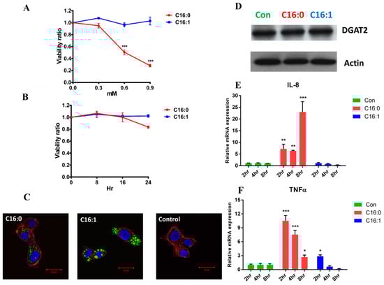 The viability of FFA-treated HepG2 cells was detected using fluorescent cell viability assays. (A) The dosage-dependent 24-h incubation with 0.3, 0.6, and 0.9 mM FFAs and (B) the time-dependent incubation with 0.3 mM FFAs. These results were representative of at least three separate experiments. (C) Observation of lipid droplets in HepG2 cell using BODIPY (493/503) staining. The cells were incubated with 0.3 mM FFAs for a 16-h treatment. Green illumination represented neutral lipid, red illumination represented F-actin, and blue illumination represented the nucleus. (D) The protein expression level of diglyceride acyltransferase 2 (DGAT2) was determined by western blot analysis. (E) The TNF-α and (F) IL-8 mRNA expression level after treatment with 0.3 mM FFAs for 2-, 4-, and 8-h incubation. The value of relative mRNA expression was normalized to the control Actin gene. (* p < 0.05, ** p < 0.01, *** p < 0.001).