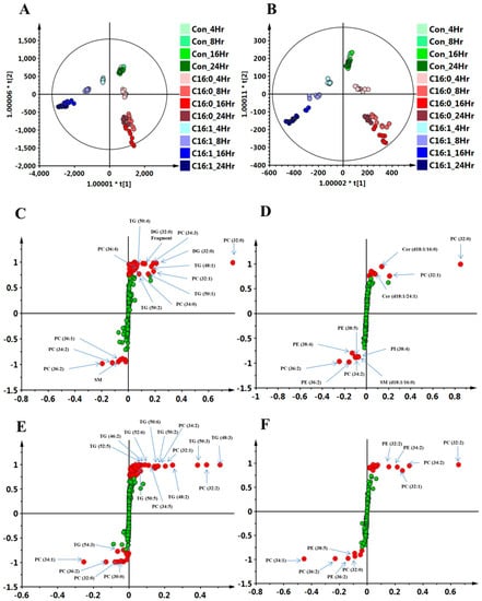 FFAs induced metabolic change in HepG2 cells performed by LC–TOFMS-based lipidomics analysis in ESI-positive and -negative modes. HepG2 cells treated with or without 0.3 mM palmitic acid (C16:0) or palmitoleic acid (C16:1) for 4, 8, 16, and 24 h were subjected to the modified Folch’s method for lipid extraction, followed by chromatography and TOF-MS analysis in ESI-positive and-negative modes. All molecular features of HepG2 cells (n = 9 per group, biological triplicates and technical triplicates) were determined by the Progenesis QI software, and subsequently, data processing and statistical analysis were performed by SIMCA-P. The orthogonal partial least squares discriminant analysis (OPLS-DA) score plot was generated from all the hydrophobic metabolite profiles and depicted in panels (A) and (B), demonstrating positive and negative modes separately. The ellipse shown in the model represents Hotelling’s T2 test with 95% confidence interval. The data of control or C16:0- and C16:1-treated cells (16-h treatment) were re-analyzed using OPLS-DA, and the metabolites with a significant difference between the normal control and C16:0 or between the normal control and C16:1-treated cells were represented in S-plots (C) (C16:0, ESI-positive mode), (D) (C16:0, ESI-negative mode), (E) (C16:1, ESI-positive mode), and (F) (16:1, ESI-negative mode). The red points were marked as the significant metabolites in the realm, p(corr) > 0.75 and p(corr) < −0.75, respectively.