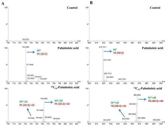 Illustration of the stable isotope-labeled C16:1 metabolite mass spectrum. (A) The peaks of PC (32:2) (M*) and its isotopomers (M* + 16 or M* + 32) detected in HepG2 cells incubated with 0.3 mM palmitoleic acid and 13C16-labeled palmitoleic acid, respectively, after16-h treatment. (B) The peaks of TG (48:3) (M*) and its isotopomers (M* + 16 or M* + 48) detected in HepG2 cells incubated with 0.3 mM palmitoleic acid and 13C16-labeled palmitoleic acid, respectively, after 16-h treatment. M* means the m/z in positive or negative mode.