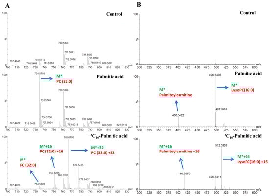 Illustration of the stable isotope-labeled C16:0 metabolite mass spectra. (A) The peaks of PC (32:0) (M*) and its isotopomers (M* + 16 or M* + 32) detected in HepG2 cells incubated with 0.3 mM palmitic acid and 13C16-labeled palmitic acid respectively after 16-h treatment. (B) The peaks of palmitoylcarnitine and LysoPC (16:0) (M*) and its isotopomers (M* + 16) detected in HepG2 cells incubated with 0.3 mM palmitic acid and 13C16-labeled palmitic acid, respectively, after 16-h treatment. M* means the m/z in positive or negative mode.