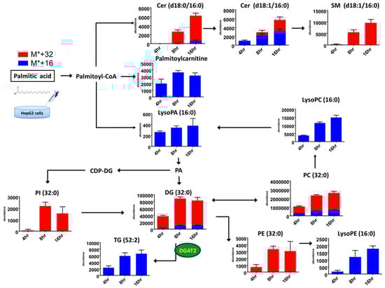 Metabolic pathways of and dynamic changes in lipid classes in HepG2 cells incubated for 4, 8, and 16 h with 0.3 mM 13C16-palmitic acid. The cellular abundances of metabolites labeled with the stable isotope were marked as blue (M* + 16), and red (M* + 32) bar charts. (mean ± SD, n = 18, triplicates).