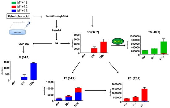 Metabolic pathways of and dynamic changes in lipid classes in HepG2 cells incubated for 4, 8, and 16 h with 0.3 mM 13C16-palmitoleic acid. The cellular abundances of metabolites labeled with the stable isotope were marked as blue (M* + 16), red (M* + 32), and green (M* + 48) bar charts. (mean ± SD, n = 18, triplicates).