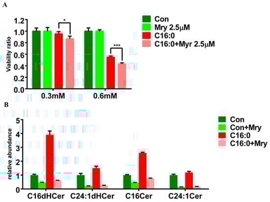 Myriocin (Myr) decreased the cell viability and ceramide levels of palmitic acid-treated HepG2 cells. (A) The 0.3 and 0.6 mM palmitic acid 24-h incubation with or without Myr. These results were representative of at least three separate experiments. (* p < 0.05, ** p < 0.01, *** p < 0.001) (B) The relative abundance of targeted ceramides in 0.3 mM palmitic acid 24-h incubation with or without Myr. Metabolic data (n = 36, triplicates) were detected using TQ-MS in ESI-positive mode and normalized to internal control, C17 ceramide, and total cell protein levels.