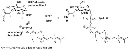 Infections with bacterial strains that have developed resistance against clinically used antibiotics are on the rise and represent a major challenge in healthcare [,]. New targets and new modes of action are needed to fight back such infections. Such novel targets can also be found in bacterial pathways that have already been addressed by many antibiotics []. MraY (translocase I) represents an example of a yet unexploited target, as it is part of bacterial peptidoglycan biosynthesis, i.e., one of the main pathways addressed by established antibiotics [,]. MraY catalyses the first membrane-associated step of peptidoglycan formation: the reaction of UDP-MurNAc pentapeptide (‘Park’s nucleotide’) 1 with the isoprenoid membrane anchor undecaprenyl phosphate 2, thus yielding membrane-bound lipid I 3 (Scheme 1) [,,,,,,].