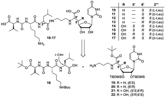 With all required building blocks in hand, the target structures could be prepared. The urea tripeptide building block 18 was activated with EDC in the presence of HOBt and then treated with amines 19–22 (Scheme 5). Corresponding coupling products were not characterised but directly employed in global acidic deprotections with 80% TFA in water. For each two-step transformation of this type, two compounds were isolated by preparative HPLC, showing identical masses and connectivities (as proven by NMR spectroscopy). It was concluded that the activated leucine unit in tripeptide 18 must have undergone epimerisation in the coupling step, which implied that the respective l-leucine and d-leucine epimers were isolated in pure form (after HPLC) from just one two-step transformation for every variation of the nucleoside core. This was unambiguously proven by acidic hydrolysis of the respective stereoisomerically pure peptidic products, subsequent derivatisation with Marfey’s reagent and HPLC analysis, which also furnished the stereochemical assignment of the leucine unit (see Supplementary Materials). Hence, it was not necessary to prepare the d-leucine epimer of 18 as all target structures (10–17) were synthesised from one urea tripeptide precursor in a highly efficient manner (Scheme 5).