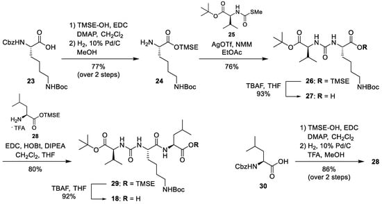 Protected urea tripeptide 18 was synthesised from corresponding amino acid building blocks (Scheme 3). Commercially available Nα-Cbz-Nε-Boc-protected l-lysine 23 was converted into its 2-(trimethylsilyl)ethyl (TMSE) ester using a sequence of 1-ethyl-3-(3-dimethylaminopropyl)carbodiimide hydrochloride (EDC)-mediated esterification and Nα-Cbz deprotection (77% yield over two steps). The resultant product 24 was coupled with N-(S-methyl thiocarbonyl)-l-valine-tert-butyl ester 25 [] in the presence of silver triflate to give 26 in 76% yield. TMSE deprotection with tetrabutylammonium fluoride (TBAF) then afforded the free carboxylic acid 27 in 93% yield. Urea dipeptide 27 was coupled with l-leucine TMSE ester 28 (TFA salt) to give urea tripeptide ester 29 in 80% yield. Subsequent cleavage of the TMSE ester furnished the urea tripeptide building block 18 in 92% yield. The l-leucine TMSE ester 28 had been obtained in a similar manner as its l-lysine congener from N-Cbz-l-leucine 30 via a sequence of EDC-mediated esterification and N-Cbz deprotection (86% yield over 2 steps, Scheme 3).