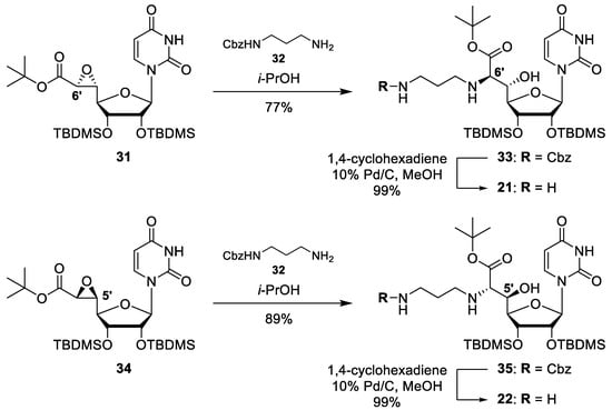 The stereocontrolled synthesis of the aminoalkylated 5′-deoxy nucleosyl amino acids 19 and 20 has been reported before []. For the preparation of the 5′-hydroxylated building blocks 21 and 22, we have employed our previously described stereocontrolled syntheses of corresponding epoxy ester precursors []. In the case of 6′-epimer 21, epoxy ester 31 was obtained via stereoselective reaction of a sulphur ylide with a uridine-5′-aldehyde precursor (reactions not shown) [,,,]. Epoxide 31 was then reacted with N1-(Cbz)-1,3-diaminopropane 32 in a regioselective SN2-type transformation affording amino alcohol 33 in 77% yield (Scheme 4). Subsequent N-Cbz deprotection (99% yield) gave the 6′-epi building block 21. For 5′-epimer 22, epoxy ester 34 was obtained via Sharpless epoxidation (reactions not shown) [,]. Epoxide 34 was then subjected to a similar sequence of regioselective SN2-type ring opening (product 35, 89% yield) and N-Cbz deprotection (99% yield) to afford the 5′-epi building block 22 (Scheme 4).