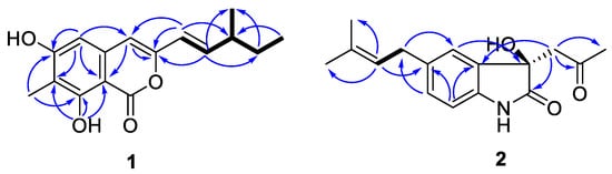 Key 1H-1H COSY (bold) and HMBC (solid arrows, blue) correlations of compounds 1 and 2.