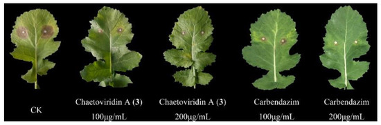 Effects of chaetoviridin A (3) against S. sclerotiorum-infected cole leaves. CK, control check (5% DMSO without compounds).