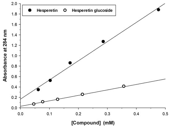 Absorbance at 284 nm vs. concentration for hesperetin and its monoglucoside.