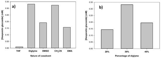 Several reaction parameters were assessed in order to increase the yield of the hesperetin monoglucoside. First, the effect of the nature of the organic cosolvent was studied fixing the organic solvent concentration at 30% v/v. Figure 4a represents the concentration of the 7′-O-α-d-glucoside after 18 h reaction. As shown, bis(2-methoxyethyl) ether (diglyme) and acetonitrile gave rise to the highest production levels of the monoglucoside. No reaction was observed in absence of cosolvent and it was very slow in the case of THF. Then, we varied the percentage of diglyme in the range 20–40%. As illustrated in Figure 4b, 30% v/v was the optimum value. It is likely that increasing the cosolvent percentage above 30% could cause certain inactivation of CGTase, despite the enhancement of hesperetin solubility.