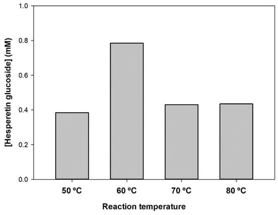 Then, we studied the effect of temperature on the reaction course. Figure 5 represents the formation of hesperetin monoglucoside at different temperatures (50–80 °C) after 18 h. As illustrated, 60 °C was the optimum temperature, in accordance with other biotransformations catalyzed by this enzyme [39,46], since this temperature represents a compromise between enzyme activity and protein stability.