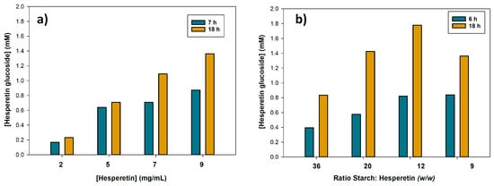The ratio glucosyl donor: acceptor is a critical point in enzyme-catalyzed transglycosylations. First, we varied the concentrations of soluble starch and hesperetin but maintaining a ratio 20:1 w/w between them (Figure 6a). As shown, the higher the concentration of hesperetin and starch, the higher the amount of glucoside synthesized. In a second step, we fixed the concentration of soluble starch (180 mg/mL) and varied the concentration of hesperetin in the range 5–20 mg/mL (Figure 6b). The maximum yield of glucoside after 18 h reaction (1.8 mM) was obtained using 15 mg/mL hesperetin, which corresponded to a ratio 12:1 w/w starch/hesperetin.