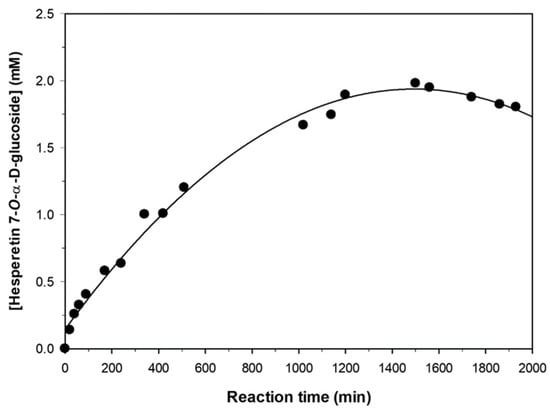 We analyzed in detail the formation of hesperetin 7-O-α-d-glucopyranoside under the optimal conditions described before (Figure 7). As shown, the maximum concentration of monoglucoside was approximately 2 mM, obtained at 24 h reaction. Taking into account that the initial concentration of hesperetin was 49 mM (although the actual value was significantly much lower because most of the hesperetin remained in solid form, even in the presence of 30% v/v diglyme), the conversion yield was close to 4.1%. Shimoda et al. reported yields between 10–15% of the 3′-, 5- and 7-O-α-d-glucosides [28]; however, they employed a concentration of hesperetin of 0.02 mM, 2500-fold lower than the used in the present work. In addition, the enzymatic process carried out with CGTase is more regioselective than that mentioned before. In addition, the β-glucosylation of hesperetin catalyzed by plant cells also takes place with low selectivity [29,43].