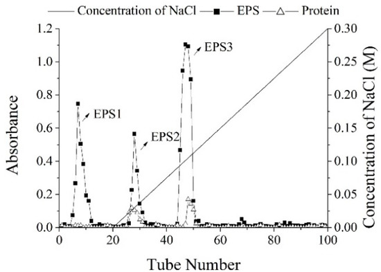 The sugar content of EPS crude polysaccharide was 87.33%, and its yield was 219.25 mg/L. In Figure 1, the solution of crude EPS was applied to a column of DEAE-52, resulting in three fractions, which eluted with the distilled water, 0.05 M, and 0.1 M NaCl solutions, named as EPS-1, EPS-2, and EPS-3 (the ratio was 31.32%, 24.33%, and 44.35%), respectively. Since DEAE is an anion exchanger with positive charge, in the process of balance, it could bind to negatively charged balance ions in the buffer [16]. After loading the EPS crude polysaccharide, the acidic polysaccharides with negative charge could exchange with balance ions, and bind to the chromatographic column. When eluting, the neutral groups were removed with distilled water, and the negatively charged groups were removed with NaCl. The EPS1 was eluted by distilled water, indicating that EPS1 was a neutral polysaccharide. However, EPS2 and EPS3 were eluted by NaCl, indicating that they were ascribed to acidic polysaccharides. In Figure 2, three independent fractions (EPS-1a, EPS-2a, and EPS-3a) were obtained by a column of G-100. Then, their carbohydrate and protein contents were detected, indicating that EPS-3a contained the highest content of protein.