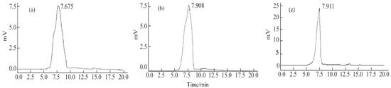 The HPGPC profiles of EPS1a (a), EPS2a (b), and EPS3a (c) determined by a HPLC System. The mobile phase was ultrapure water at a flow rate of 0.8 mL/min. The temperature of the chromatographic column (Shodex OHpak SB-804 HQ) was 30 °C.