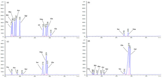 The GC profiles of standard monosaccharides (a), EPS-1a (b), EPS-2a (c), and EPS-3a (d) determined by GC system.