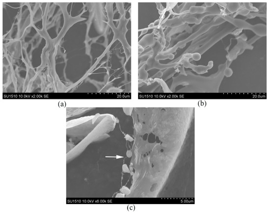 The analysis of microstructure and surface morphology of the polymers was conducted by scanning electron microscopy (SEM, JEOL/EO, and model JSM-6380, JEOL Ltd, Tokyo, Japan) at an accelerating voltage of 10 kV. The conductive adhesive was cut to 0.5 cm with scissors, and pasted onto the sample table. Then, the EPS samples were taken with a cotton swab, and placed onto the conductive adhesive. The cotton swab was used to fully disperse the samples, and the unfixed samples were removed with a rubber suction bulb. Before SEM examination, all samples were coated with a layer of gold. After putting the sample table into SEM, the morphology of EPS was observed.