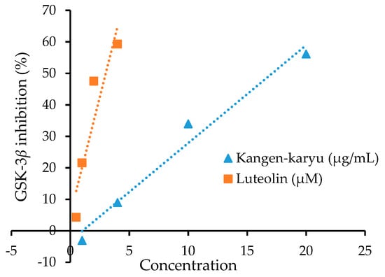The water extract of KK and its individual components were evaluated for their inhibitory potential against GSK-3β in vitro. Figure 2 represents a linear graph of 50% inhibition of GSK-3β enzyme by KK and the reference compound luteolin. Table 1 tabulates the mean results for three different experiments on each component.