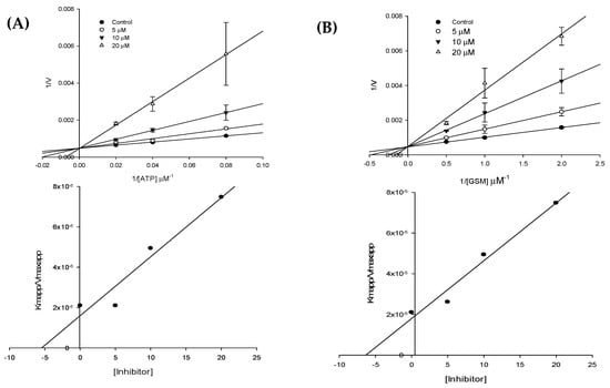 The GSK-3β enzyme kinetics was evaluated by using the assay method described in Section 4.4 with varying concentrations of ATP (2 µM, 1 µM, or 0.5 µM) or substrate (50 µM, 25 µM, or 12.5 µM). A Lineweaver–Burk plot was prepared by using double reciprocal plots of enzyme kinetic data. Ki values were calculated from the secondary plots.
