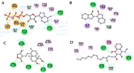 Figure 5. 2D Diagram showing the binding of reference controls, AMP-PNP (A), indirubin (B), andrographolide (C), and VP0.7 (D), to GSK-3β active site.