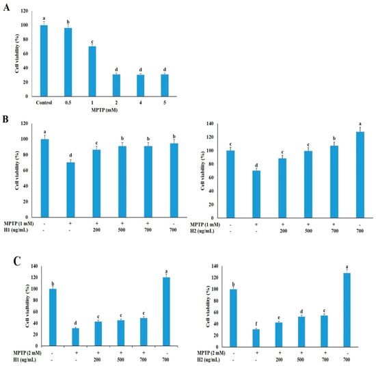 Figure 1. Hepad 1 (H1) and Hepad 2 (H2) inhibit 1-methyl-4-phenyl-1,2,3,6-tetrahydropyridine (MPTP)-induced cell death in SH-SY5Y cells. (A) SH-SY5Y cells (2 × 106) were incubated in the absence or presence of MPTP for 24 h. SH-SY5Y cells were pre-treated with 1 mM (B) and 2 mM (C) MPTP for 4 h, and then incubated with 200, 500, and 700 µg/mL of H1 and H2 (S5) for 24 h. Subsequently, the survival rate was measured with a 3-(4,5-dimethylthiazol-2-yl)-2,5-diphenyltetrazolium bromide assay. The data are expressed as the relative ratio to the absorbance of the untreated cells, which was set at 100%, and are reported as the mean ± standard deviation of three independent experiments. Level of statistical significance for a, b, c, d, e and f is p < 0.05 (Duncan’s multiple range test).