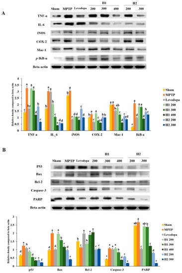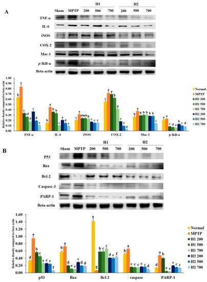 Figure 5. Effects of Hepad 1 (H1) and 2 (H2) (S5) on (A) inflammation-related responses and (B) apoptotic signaling cascades in 1-methyl-4-phenyl-1,2,3,6-tetrahydropyridine (MPTP)-treated mice. Protein extracts from brain tissues in each of the different groups were subjected to Western blotting analyses. Results are expressed as the mean ± the standard deviation. Level of statistical significance for a, b, c, d, e, and f is p < 0.05 (Duncan’s multiple range test).