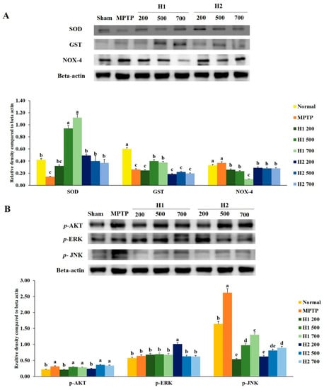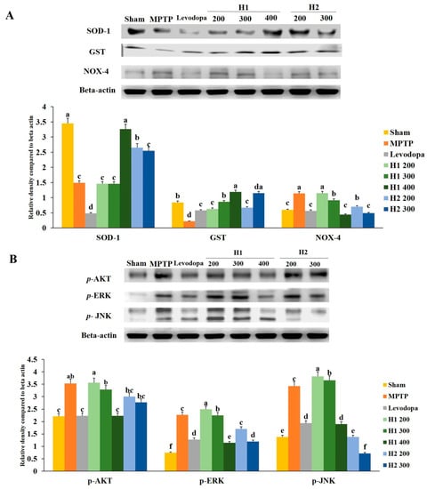 Figure 6. (A) Effects of Hepad 1 (H1) and Hepad 2 (H2) (S5) on the expression of anti-oxidant-related proteins in the brains of the Parkinson’s disease mouse model. Superoxide dismutase (SOD), glutathione S-transferase (GST), and nicotinamide adenine dinucleotide phosphate oxidase 4 (NOX-4) levels were assessed by Western blotting. (B) Effects of H1 and H2 (S5) on the expression of phosphorylated protein kinase B (p-AKT), phosphorylated extracellular signal-regulated kinase (p-ERK), and phosphorylated c-Jun N-terminal kinase (p-JNK) in the brains of the Parkinson’s disease mouse model. Results are expressed as the mean ± the standard deviation. Level of statistical significance for a, b, c, d, e, and f is p < 0.05 (Duncan’s multiple range test).