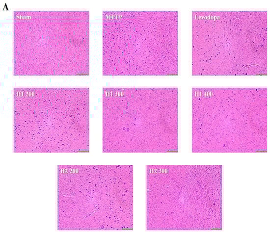 We observed that MPTP intoxication enhanced the expression levels of Bax protein compared to the levels in sham mice and that this enhancement was reduced by treatment with 200, 300, and 400 mg/kg H1 (1.0-, 1.3-, 1.7-fold, respectively), as well as 200 and 300 mg/kg H2 (2.0- and 4.8-fold, respectively) (Figure 5B). Additionally, the reduced Bcl-2 expression that was observed in MPTP- intoxicated vs. sham mice was significantly reversed by treatment with 200, 300, and 400 mg/kg H1 (1.2-, 1.7-, and 1.8-fold, respectively), but not by treatment with 200 and 300 mg/kg H2; the H1 effects (300 and 400 mg/kg) were similar to the effects observed upon treatment with levodopa (positive control) (Figure 5B).