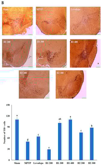 The number of TH-positive cells in the MPTP-intoxicated group was reduced by more than 2-fold compared with the number in the sham group (Figure 4). Numbers of TH-positive cells were significantly elevated in the groups treated with levodopa, H1 (300, and 400 mg/kg), or H2 (200 and 300 mg/kg) compared with the MPTP-intoxicated group (2.0-fold, and 2.2-fold after treatment with H1; 1.5- and 1.76-fold after treatment with H2, respectively) (Figure 4).