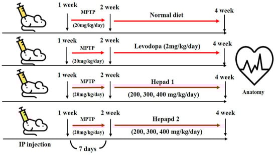 All experimental animals were approved by the Institutional Animal Care and Use Committee at Konkuk University (IACUC approval number, KU18045), Seoul, Korea. Seven-week-old male C57BL/6 mice were purchased from Orient Bio, Inc. (Seongnam-si, Korea) and housed in a temperature-controlled (21–22 °C) and light-controlled (12 h light/dark cycle) environment with 70% humidity; mice were given free access to water and rodent chow. After a 1-week adaptation period, the mice were randomly divided into nine groups (n = 8 per group) for MPTP, H1, and H2 studies, as follows: (1) normal (sham) group, (2) MPTP-intoxicated group, (3) positive group (MPTP + levodopa [2 mg/kg] [Sigma Aldrich]), (4) MPTP + H1 (200 mg/kg), (5) MPTP + H1 (300 mg/kg), (6) MPTP + H1 (400 mg/kg), (7) MPTP + H2 (200 mg/kg), (8) MPTP + H2 (300 mg/kg), and (9) MPTP + H2 (400 mg/kg). The mice in the sham group (group 1) had a normal diet for 28 days, and the mice in the MPTP-intoxicated group (group 2) were intraperitoneally injected with MPTP (20 mg/kg/day) for 28 days. In groups 3–9, MPTP (20 mg/kg/day) was administered for 7 days; then, levodopa (2 mg/kg/day), H1 (200, 300, and 400 mg/kg/day), or H2 (200, 300, and 400 mg/kg/day) were orally administered to the mice for 21 days, according to the group designations listed above. After 28 days, the mice were sacrificed by decapitation following a 16-h fast (Figure 7). The brains were dissected and analyzed by histological and Western blotting analyses. The brain tissues were stored at −70 °C in a deep freezer (ILSINTECH, Daejeon, Korea) until analysis.