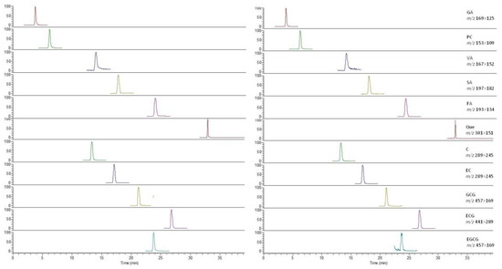 Eleven stock solutions were prepared by dissolving each authentic reference standard into a 10 mL volumetric flask with methanol, respectively. The exact concentrations were as follows: GA 10.5 mg/mL; PC 9.8 mg/mL; VA 9.9 mg/mL; SA 9.5 mg/mL; FA 9.6 mg/mL; Que 10.4 mg/mL; C 9.6 mg/mL; EC 9.2 mg/ ML; GCG 9.6 mg/mL; EGC 10.8 mg/mL; EGCG 9.8 mg/mL.