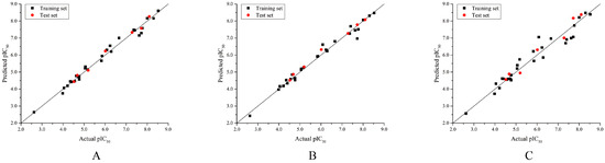 Plot of actual pIC50 against predicted pIC50 by the optimal CoMFA (A), CoMSIA (B), and Topomer CoMFA (C) models.