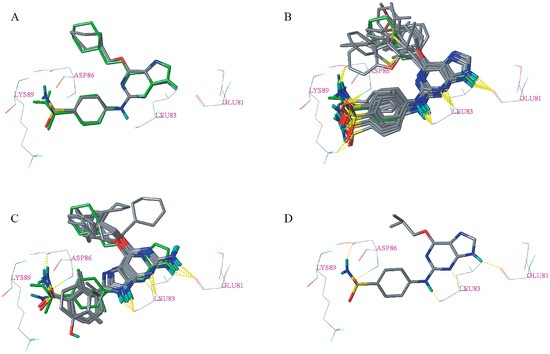 Re-docking result of the cognate ligand (A) and docking results of dataset compounds (B,C) and compound 9 (D). The cognate ligand was displayed in the green stick model. Hydrogen bonds were shown as yellow dashed lines and non-polar hydrogens were removed for clarity.