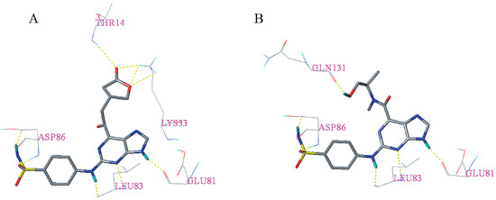 Docking results of the 31 novel candidate compounds are presented in Table S4. Surflex–Dock total score of each candidate compound is greater than eight. Except I46, I173, and I63, Cscore of the other 29 candidate compounds is greater than or equal to three. In addition, candidate compounds I13, I21, I33, I40, I44, I60, I155, and I190 showed high similarity [28] (>0.800) with the cognate ligand. These results indicated that most of the newly designed candidate compounds may have good binding affinity. As can be seen from Figure 6, candidate compounds I13 and I60 having a total score of >10, the Cscore equal to five and have a similarity of >0.800 formed hydrogen bonds with residues Glu81, Leu83, Asp86, Lys33, Thr14, and Gln131, respectively. The corresponding hydrogen bond distances between I13 and receptor are 1.850 Å (Glu81-C=O∙∙∙H-N), 2.330 Å (Leu83-N-H∙∙∙N=C), 1.990 Å (Leu83-C=O∙∙∙H-N), 1.940 Å (Asp86-N-H∙∙∙O=S), 2.040 Å (Asp86-C=O∙∙∙H-N), 2.690 Å (Thr14-N-H∙∙∙O=C), 2.010 Å (Lys33-N-H∙∙∙O=C), 2.480 Å (Lys33-N-H∙∙∙O-C), 2.750 Å (Lys33-N-H∙∙∙O-C). On the other hand, the hydrogen bond distances between I60 and receptor are 1.850 Å (Glu81-C=O∙∙∙H-N), 2.490 Å (Leu83-N-H∙∙∙N=C), 2.170 Å (Leu83-C=O∙∙∙H-N), 1.870 Å (Asp86-N-H∙∙∙O=S), 2.010 Å (Asp86-C=O∙∙∙H-N), 1.850 Å (Gln131-C=O∙∙∙H-O).