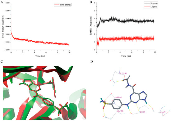 The total energy plot and the RMSDs plot for the docked complex 1H1S-I60 are shown in Figure 8A,B, respectively. The MD simulations results revealed that the total energy was fluctuated around 15,200 kcal/mol after 5 ns. The protein backbone RMSD tended to be stable and fluctuated around 3.600 Å after 4 ns simulations. The RMSD of the ligand stabilized around 1.400 Å after 1 ns simulations, which signified that the complex 1H1S-I60 had reached equilibrium. The superimposition of the initial docked structure of complex 1H1S-I60 with the average structure obtained from the last 2 ns MD simulations of the complex is shown in Figure 8C. The conformation of the I60 is stable without significant changes after MD simulations, which indicates the rationality and validity of the docking result. From Figure 6B and Figure 8D, it could be observed that the two hydrogen bonds between the sulfonamide group of the I60 and residue Asp86 have disappeared after MD simulations. However, three new hydrogen bonds are formed between I60 and Asp86, Gln85 and Gln131 at the distance of 1.380 Å (Asp86-O-H∙∙∙O=S), 2.750 Å (Gln85-N-H∙∙∙O=S), and 2.320 Å (Gln131-N-H∙∙∙O-C), respectively. The hydrogen bond distance between the 9-H and Glu81, the N-3 and Leu83, the 2-NH and Leu83, and the –OH and Gln131 was changed from 1.850 to 1.790 Å, 2.490 to 2.370 Å, 2.170 to 1.740 Å, and 1.850 to 2.890 Å after MD simulations.