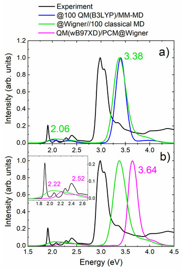 - Zuehlsdorff, T.J.; Isborn, C.M. Combining the ensemble and Franck-Condon approaches for calculating spectral shapes of molecules in solution. J. Chem. Phys. 2018, 148. [Google Scholar] [CrossRef] [PubMed]